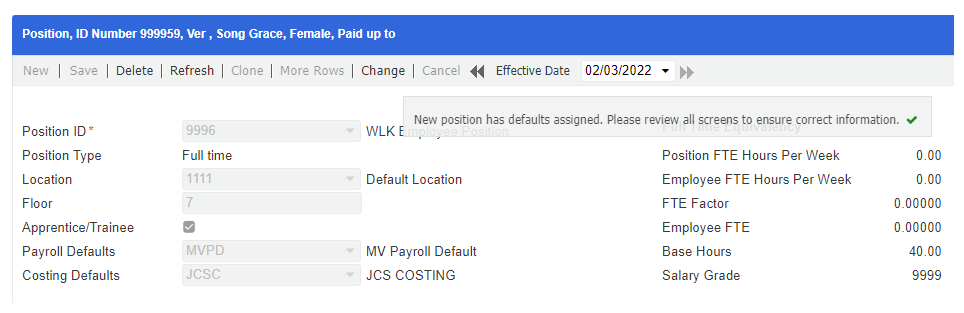 - In the case that the user does not have Change access to this checkbox and has to create a new position record where a position has defaults assigned to it, the defaults will be applied to the employee.